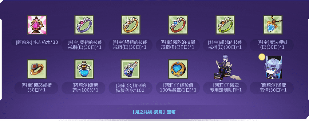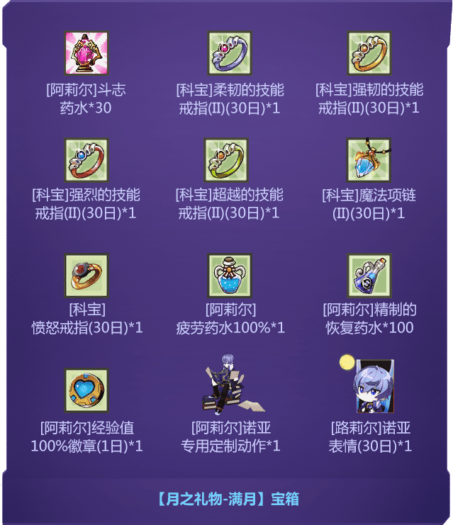 - 22021年1月13日 例行维护后~2月9日 例行维护前,登录游戏 并 创建新角色“诺亚”,即可在新角色的邮箱中获得【月之礼物-满月】宝箱奖励。(详见官网公告)(详见官网公告)