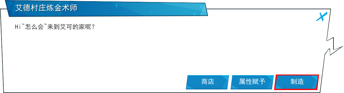 与各村庄的NPC对话时,可以看到拥有[制造]、[升级]按钮的NPC。 如果拥有制造所需的材料道具与ED,就可以在NPC处制造道具。