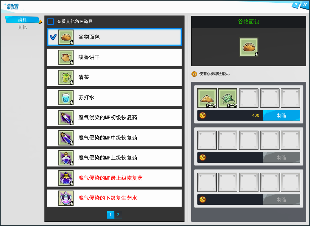 点击想要制造的道具时,右侧材料栏将显示所需材料数量、持有材料数量以及制造手续费等信息。