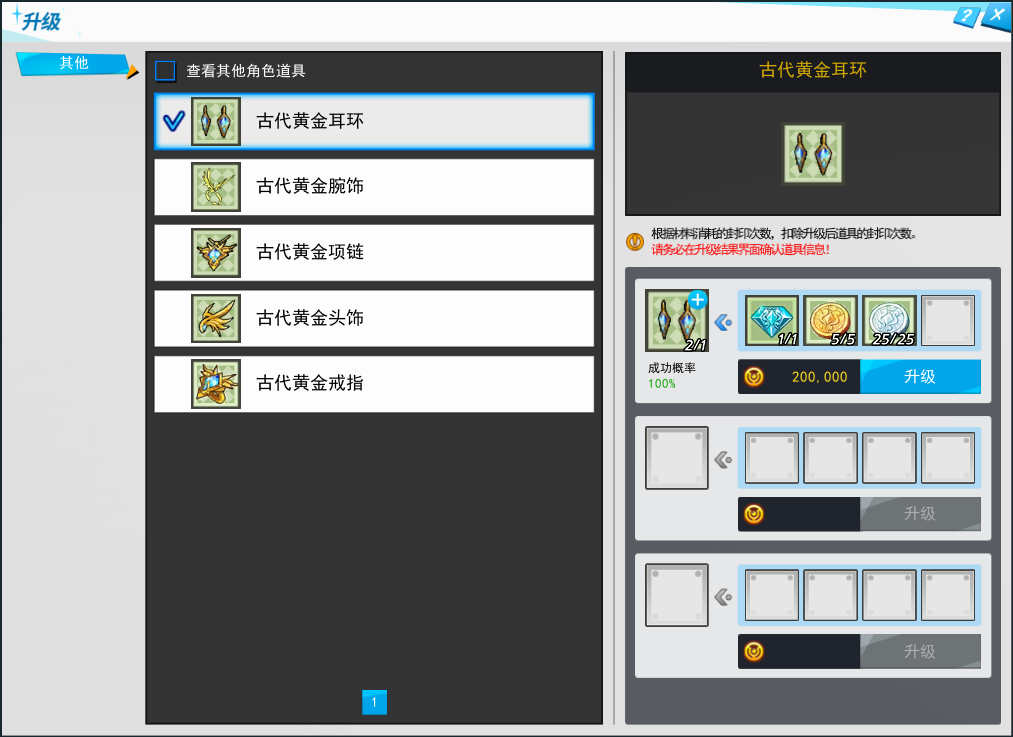 升级 升级是将持有的装备道具升级为能力值更出色的道具的功能,使用方法与制造相似。 升级时会根据主材料消耗的封印次数,扣除升级后道具的封印次数。保留强化等级/魔法石效果/属性效果,但追加效果会初始化。