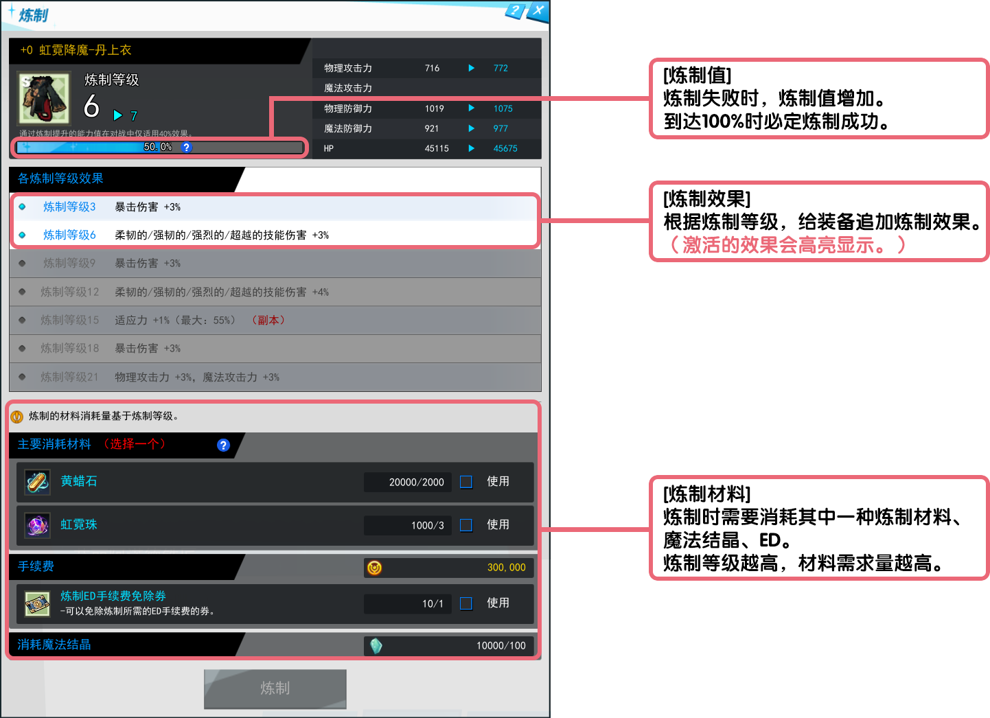 | 炼制失败 | 炼制值增加。 炼制值达到最大值时,下次不炼制消耗炼制材料,100%成功。 炼制值的增加量基于当前的炼制等级。 |
