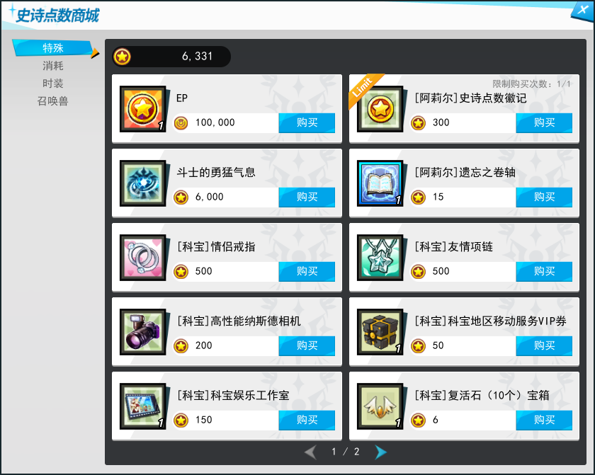 史诗点数商城(EP商城)使用方法 通过各村庄的NPC阿莉尔可以进入史诗点数商城(EP商城),使用EP可以购买各种时尚、便捷的功能道具。