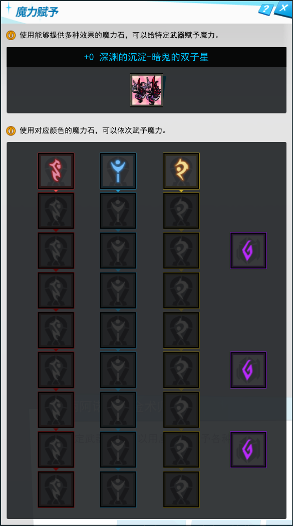 深渊的沉淀-暗鬼的武器默认拥有红色/蓝色/黄色魔力石槽各9个,巨型魔力石槽3个。