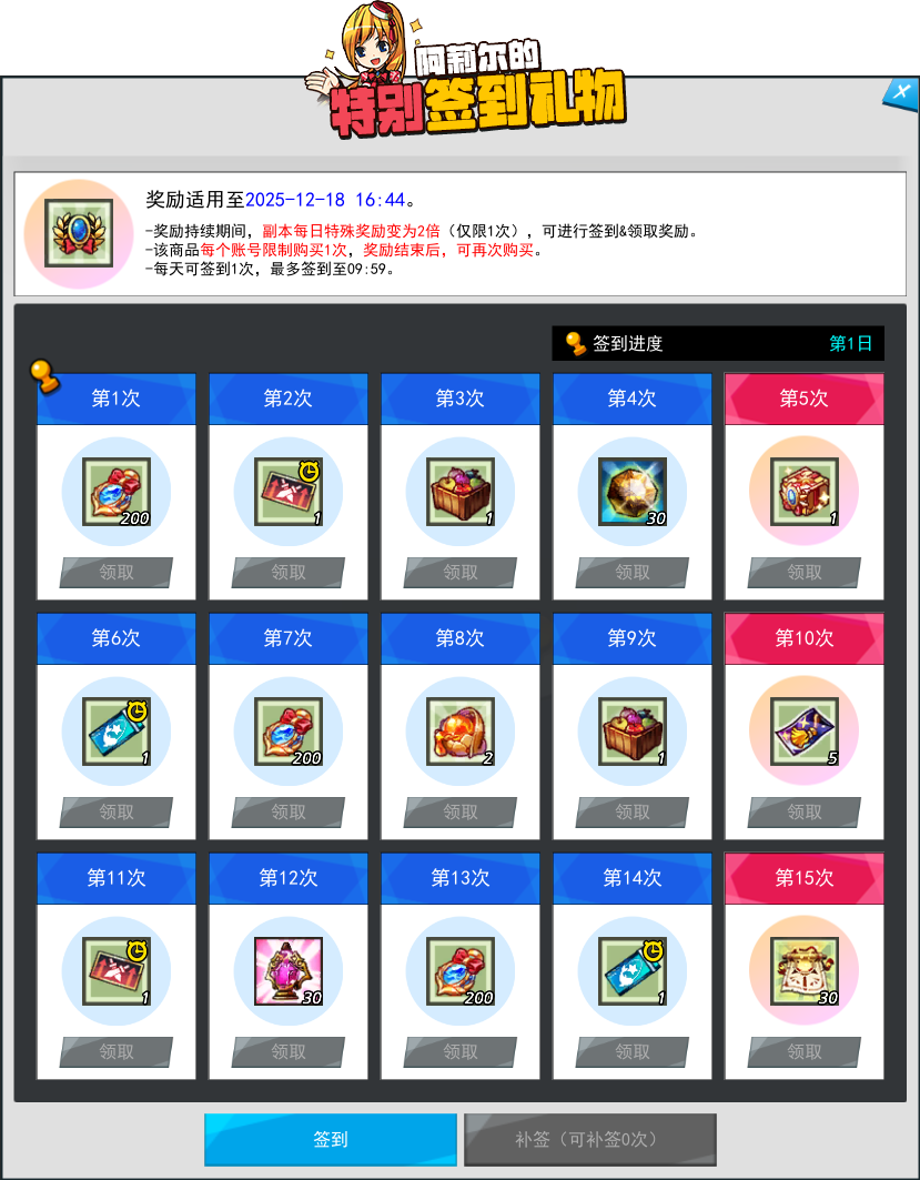 -购买“阿莉尔的特别签到礼物”后,可在奖励持续期间(30天)内进行15次签到并获得奖励。