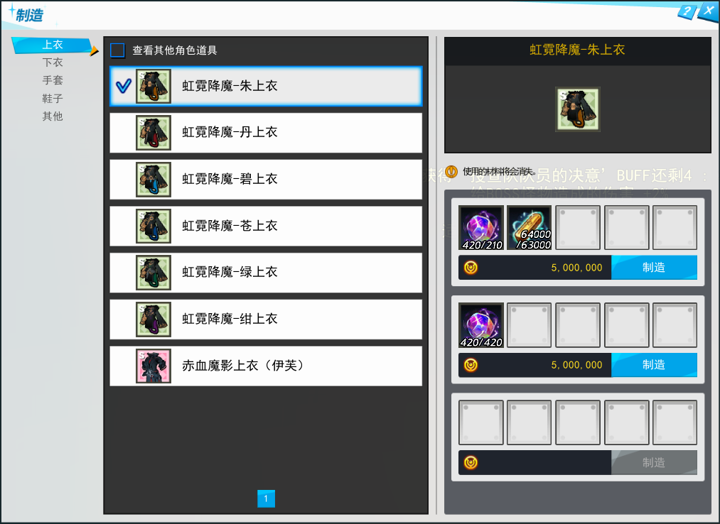 制造虹霓降魔防具时有2种方式:使用420个虹霓珠进行制造、使用210个虹霓珠和63000个黄蜡石进行制造。