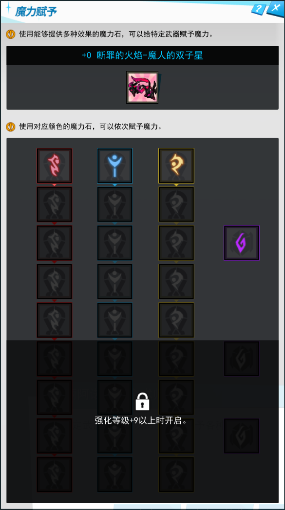 当强化等级达到+9以上时,会额外解锁红色/蓝色/黄色魔力石槽各4个,巨型魔力石槽2个。