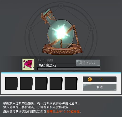 使用5个道具来制造新的道具。放入的道具的出售价越高,获得的副职经验值、烧瓶值越多。