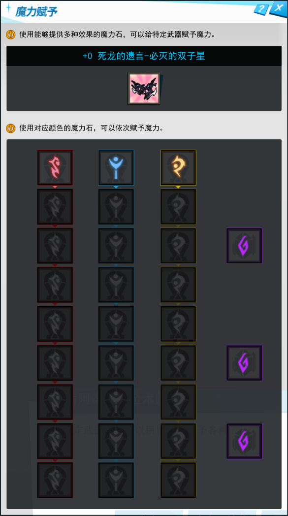 死龙的遗言-必灭的武器默认拥有红色/蓝色/黄色魔力石槽各9个,巨型魔力石槽3个。